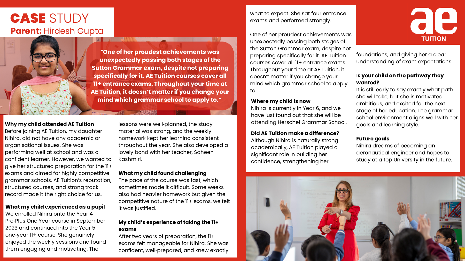 Each class has up to 24 pupils in a class (up to 18 pupils for groups in Feltham and our remote courses). We believe that tuition should be taught by teachers. This is why each course is taught by UK-qualified, experienced teachers trained to deliver AE Tuition’s specialised programmes. During each session, pupils receive expert tuition from the teacher in the main classroom. Individual support dealing with problems resulting from the homework review are dealt with by trained assistants under the direction supervisors.
