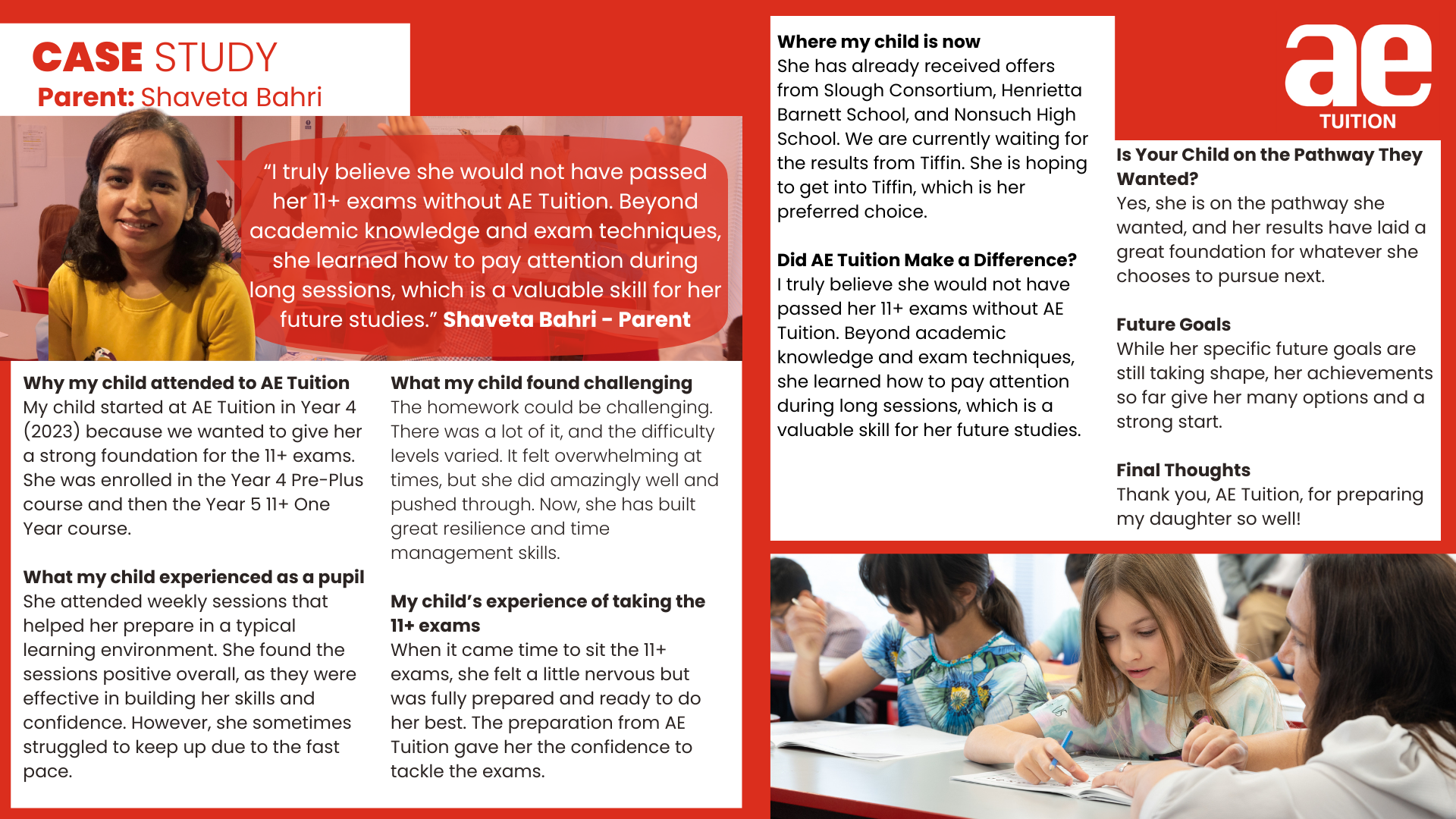 “I truly believe she would not have passed her 11+ exams without AE Tuition. Beyond academic knowledge and exam techniques, she learned how to pay attention during long sessions, which is a valuable skill for her future studies.” Shaveta Bahri – Parent